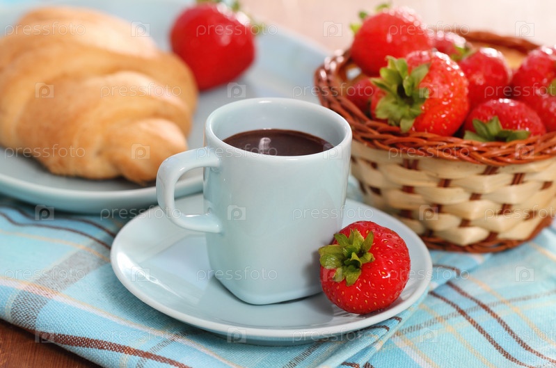 Вкусный свежий завтрак с клубникой и горячим шоколадом солнечным утром