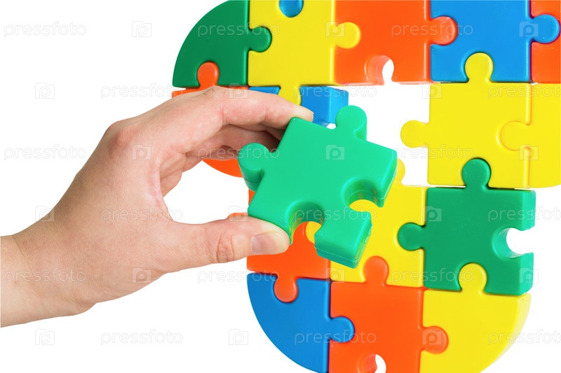 Рука собирает цветные головоломки на белом фоне