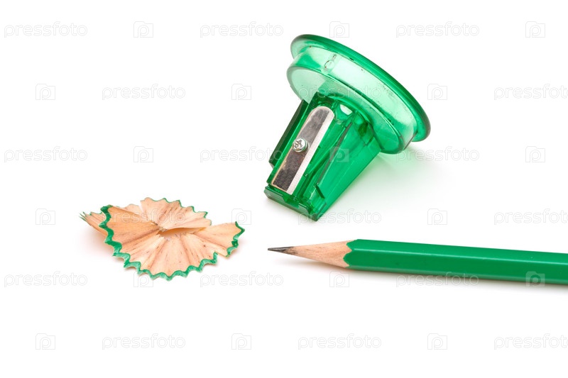 Зеленая точилка и карандаш на белом фоне