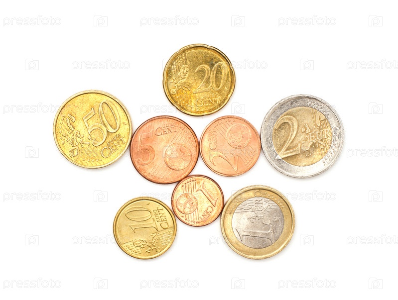 Несколько монет евро на белом фоне