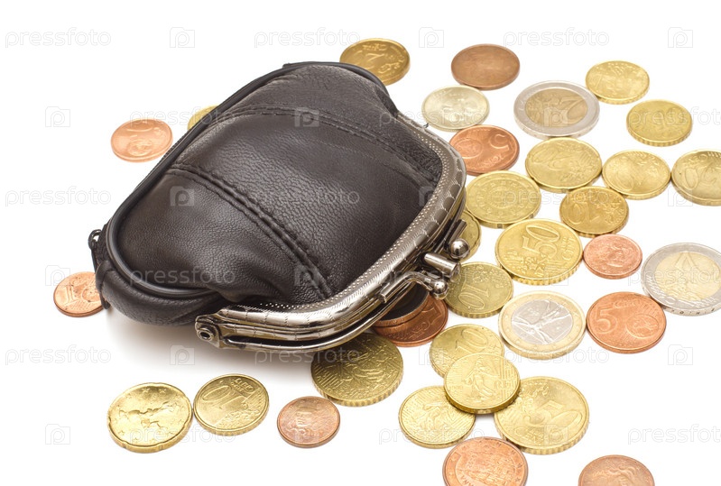 Черный кожаный кошелек с евро на белом фоне