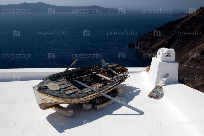 Одна из достопримечательностей острова Санторини - старая лодка на крыше одного из домов