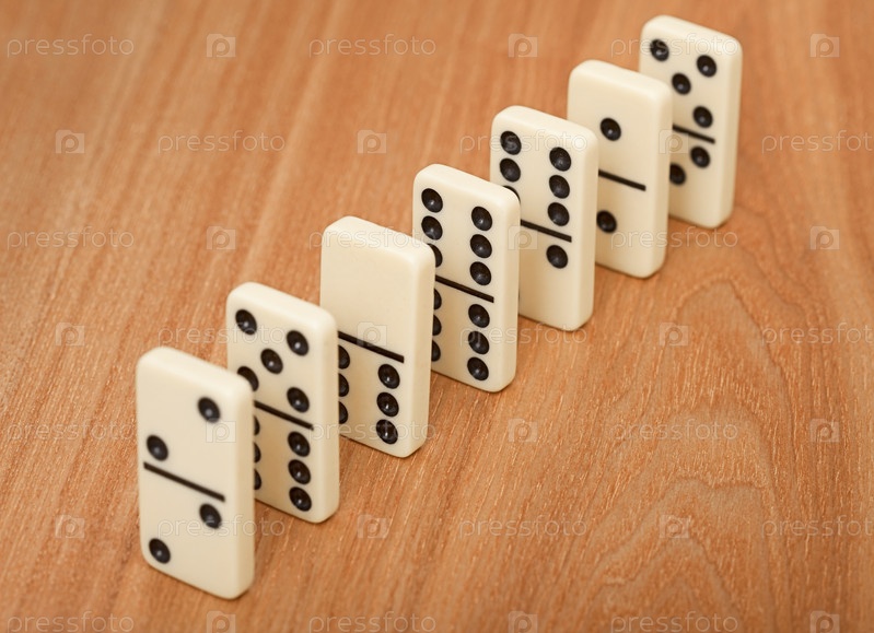 Кости игрового домино выстроены в ряд на деревянной поверхности стола