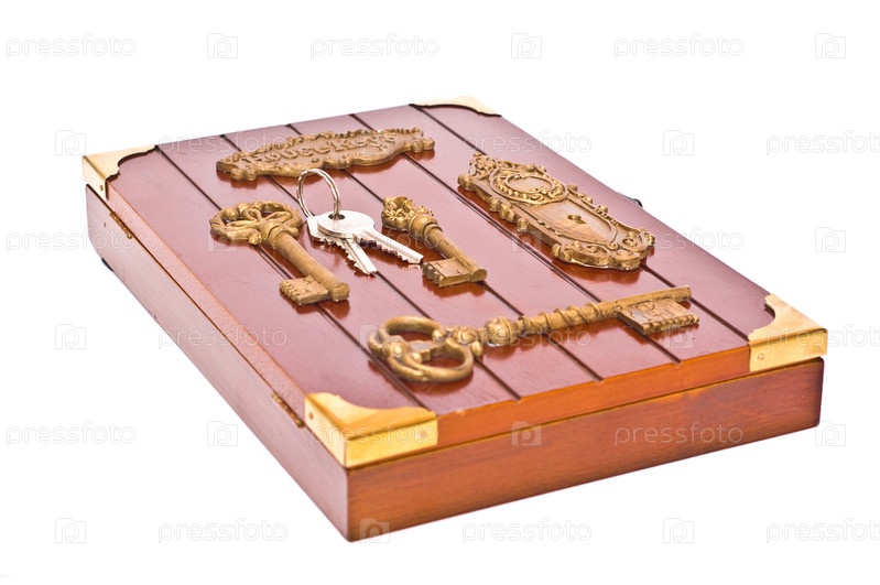 Деревянная коробка с ключами от дома на белом