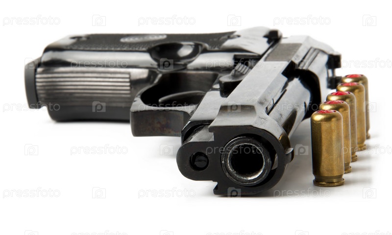 Пистолет и пули на белом фоне