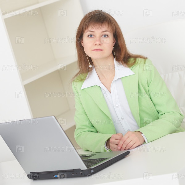 Молодая девушка сидит за столом с ноутбуком на светлом фоне