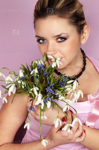 Молодая красивая женщина с букетом подснежников