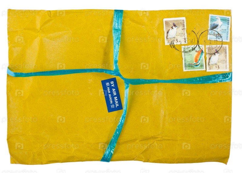 Желтый конверт с марками на белом фоне
