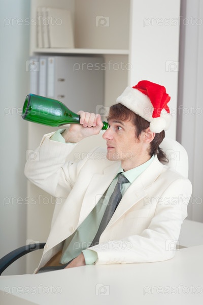 Молодой бизнесмен празднует Рождество прямо на рабочем месте в офисе