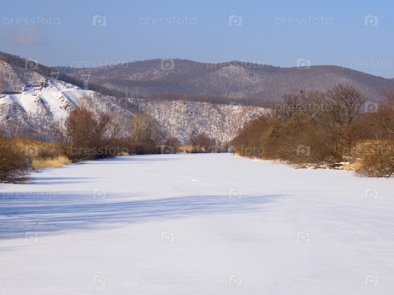 Замерзшая река в зимний солнечный день