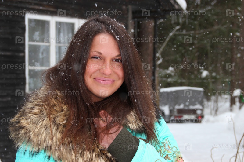 Темноволосая красивая женщина на стоит улице зимой