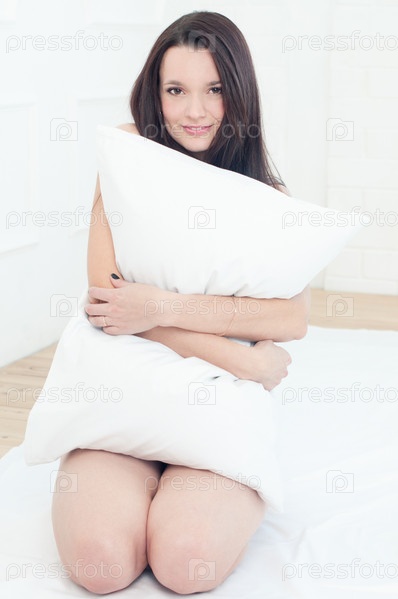 Улыбающаяся молодая женщина сидит в постели с подушкой в руках