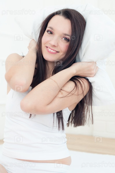 Улыбающаяся молодая женщина с подушкой в руках