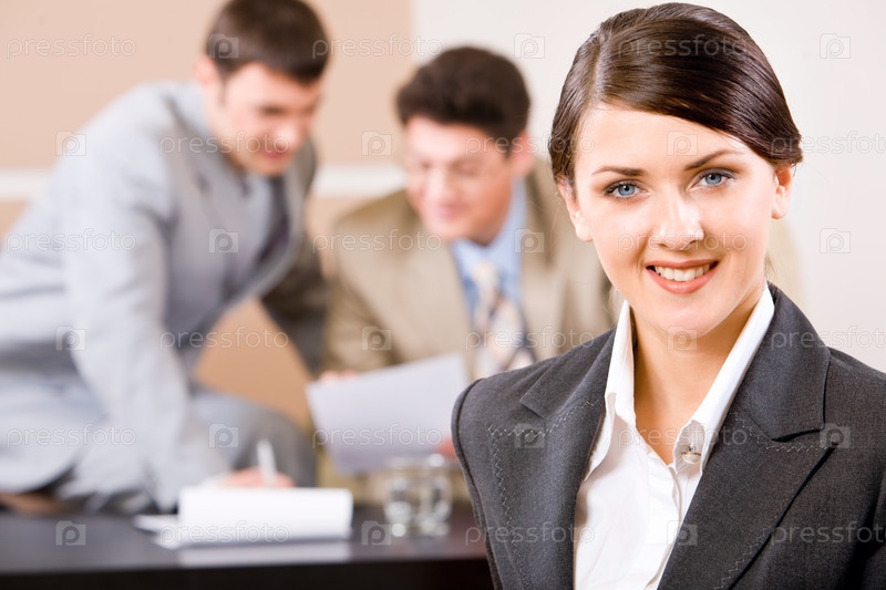 Портрет уверенной в себе женщины с очаровательной улыбкой на фоне двух бизнесменов