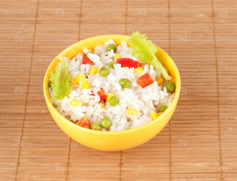 Рис с овощами в миске на белом фоне
