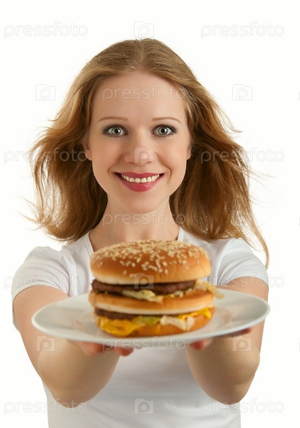Привлекательная девушка предлагает гамбургер, изолирована на белом фоне