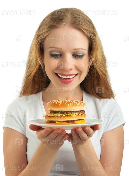 Привлекательная девушка смотрит на гамбургер, изолирована на белом фоне