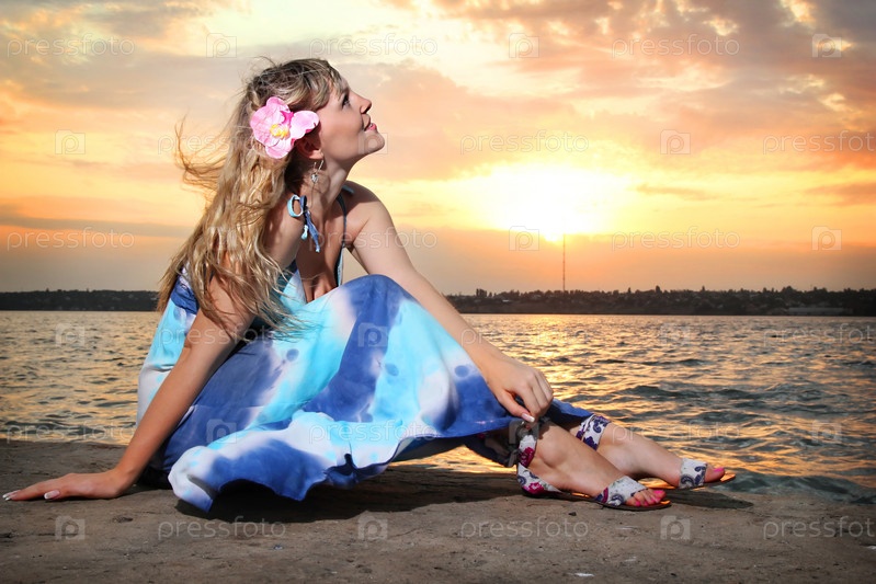 Романтическая блондинка на пляже, закат