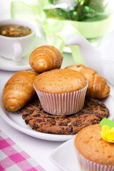 Завтрак с круассанами, кексом и шоколадным печеньем