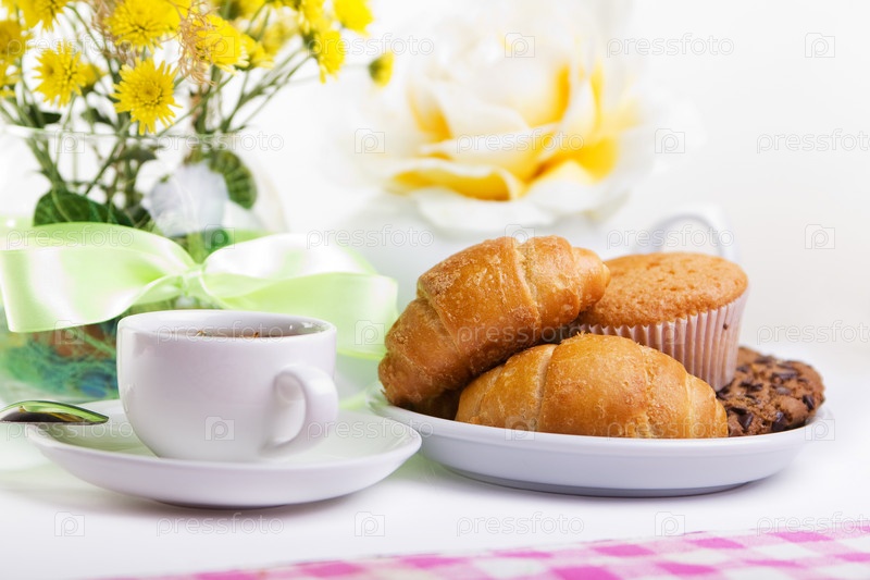 Завтрак с круассанами, кексом и шоколадным печеньем
