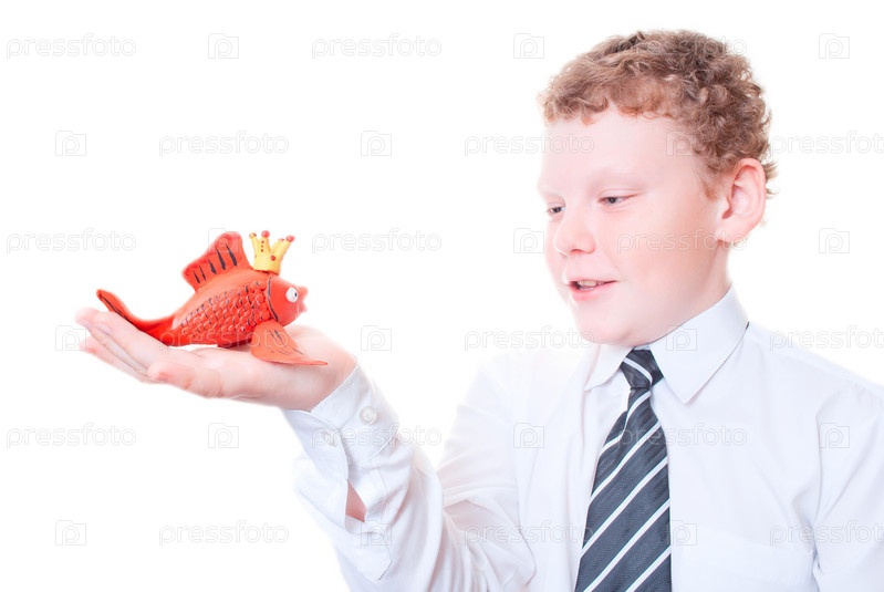Мальчик держит в руках золотую рыбку