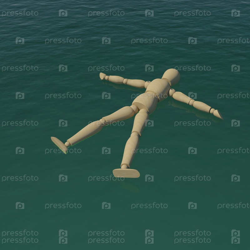 Деревянный человек, плавающий в морской воде. 3D