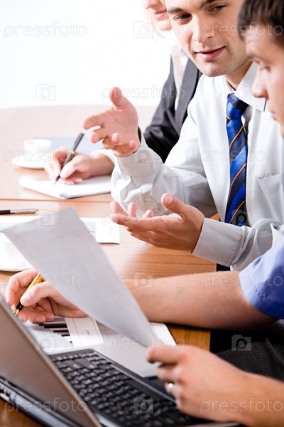 Бизнесмен объясняет идею проекта своему коллеге в офисе