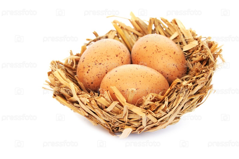 Пасхальные яйца в гнезде на белом фоне