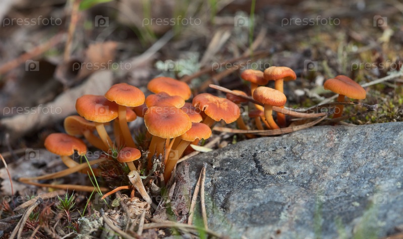 Небольшой пластинчатый гриб с оранжевой шляпой, растущий в осеннем лесу