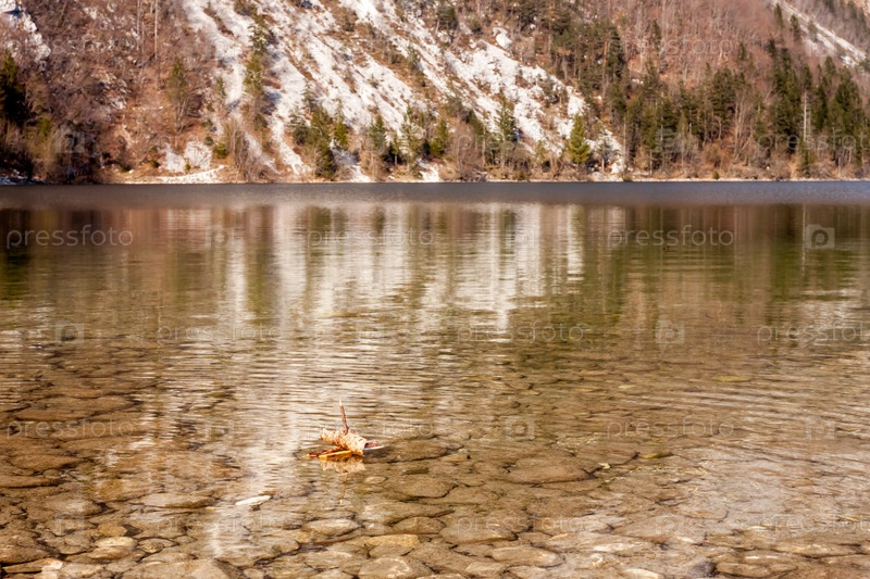 Озеро Бохинь с игрушечной берестяной лодкой