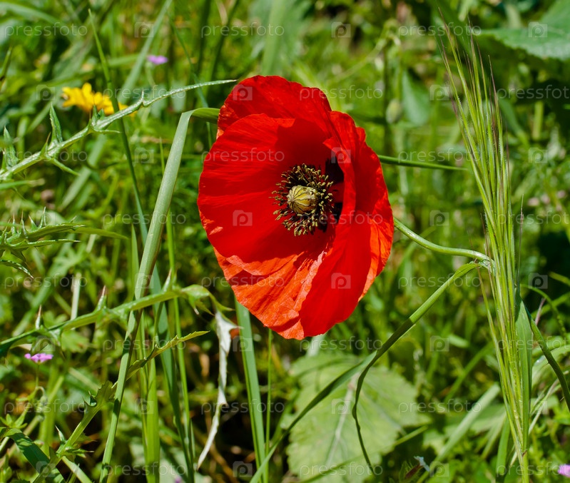Красный мак на зеленом фоне