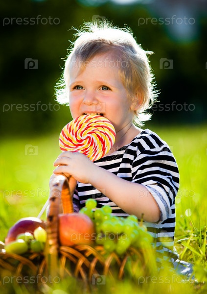 Маленький мальчик с леденцом на зеленой траве