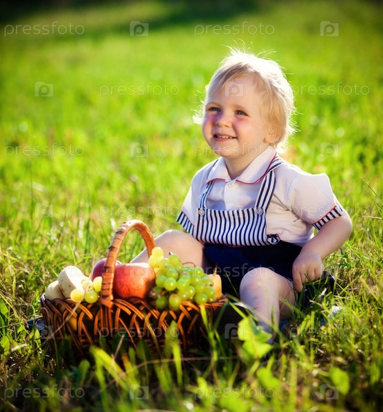 Маленький мальчик с корзиной фруктов сидит на траве