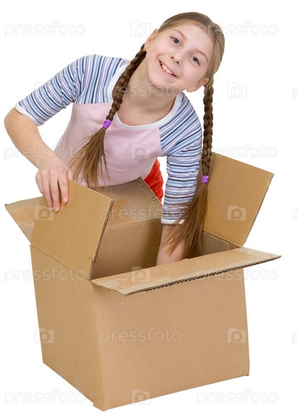 Девочка-подросток улыбается и проникает рукой в картонную коробку, изолированную на белом фоне