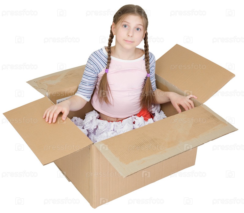 Девочка-подросток улыбается и проникает рукой в картонную коробку, изолированную на белом фоне