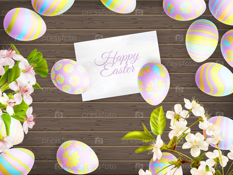 Пасхальные яйца на деревянном фоне. EPS 10