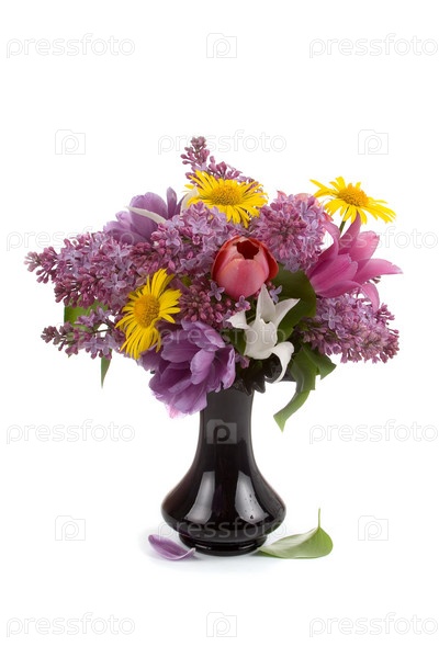 Прекрасный весенний букет из сирени и тюльпанов на белом фоне