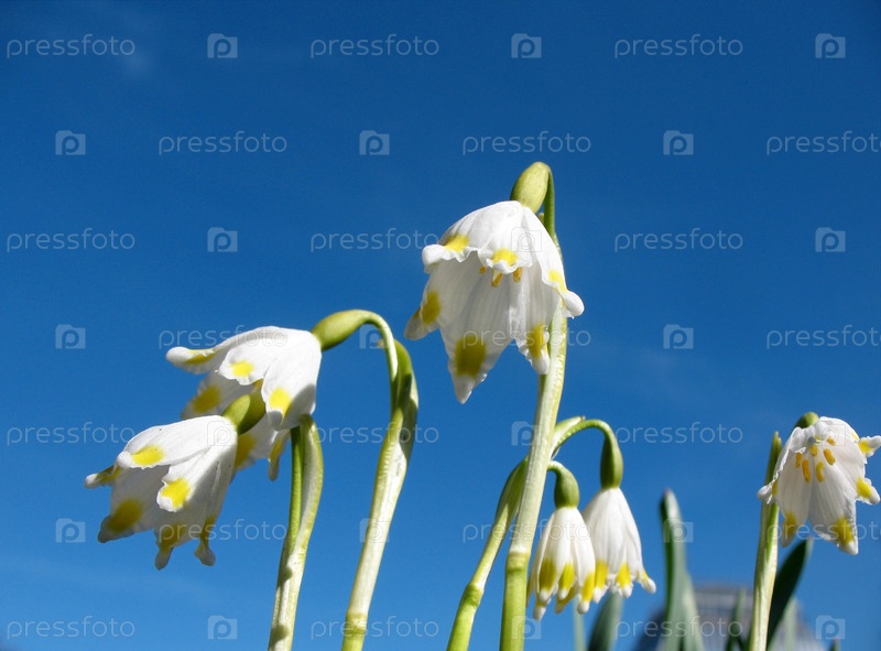 Белоцветник весенний, Leucojum vernum, на фоне голубого неба