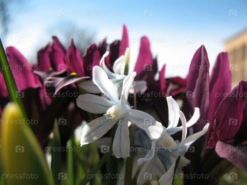 Белоцветник весенний, Leucojum vernum, на фоне голубого неба