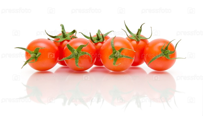 Семь спелых помидоров на белом фоне