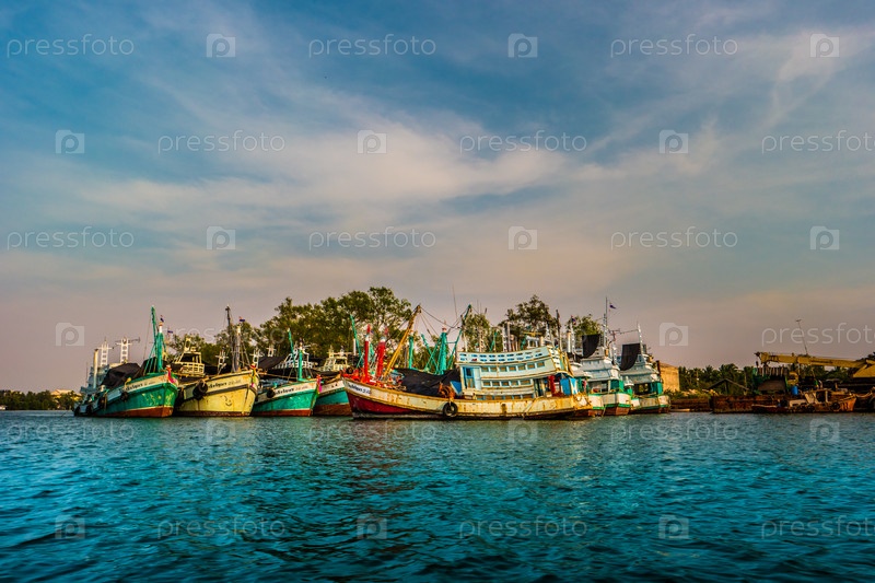 Группа красочных рыбацких лодок на закате
