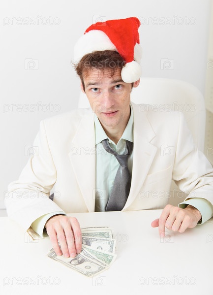 Молодой бизнесмен в рождественской красной шляпе и пакете долларов