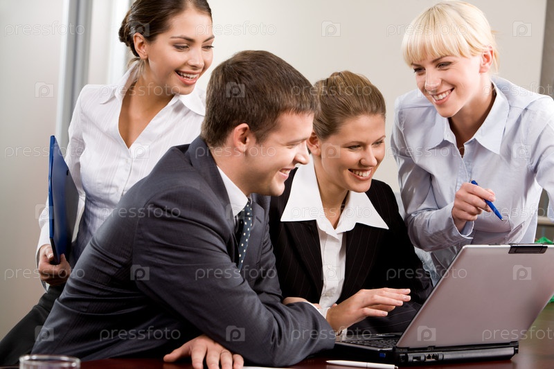 Деловые люди сидят перед ноутбуком и делятся идеями