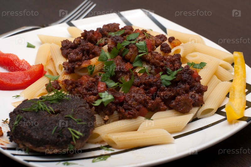 Большая тарелка с котлетом и макаронами