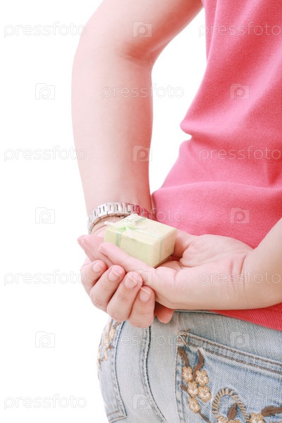 Девушка держит коробочку с поларком за спиной