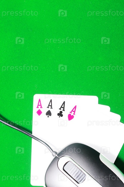 Игральные карты и компьютерная мышь на зеленом фоне