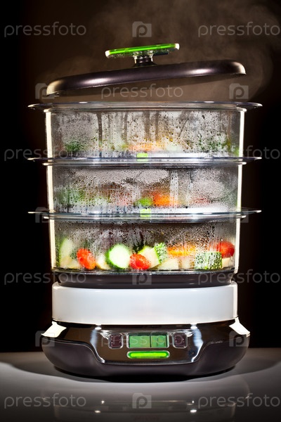 Пароварка с овощами на темном фоне