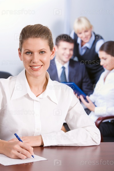 Портрет красивой офисной работницы, пишущей текст на фоне деловых людей