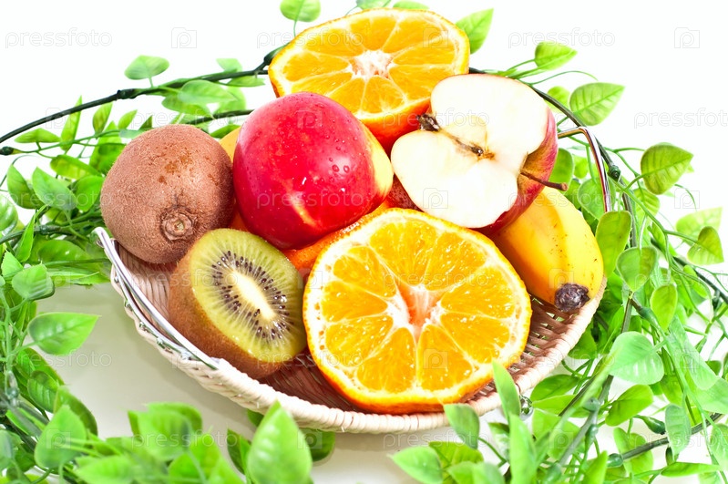 Порезать фрукты в корзину с зелеными листьями, изолированными на белом