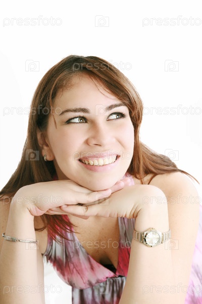 Молодая счастливая женщина на белом фоне